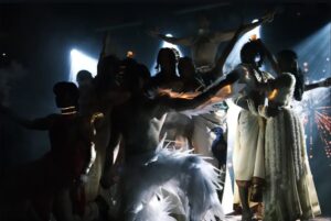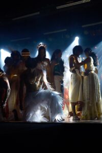 The performers stand poised and expressive, creating an atmosphere filled with elegance, intensity, and artistic unity. The interplay of shadows with bright backlighting adds a sense of mystique and grandeur, making the entire scene appear like a living artwork. It beautifully celebrates tradition, storytelling, and visual beauty, leaving a lasting impression on the audience.