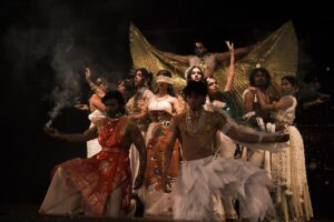 The image captures a powerful and visually striking moment from a stage performance, featuring performers dressed in elaborate Kerala-inspired costumes illuminated by dramatic beams of light. Rich textures—flowing fabrics, feathered detailing, gold accents, and traditional motifs—bring out the depth, artistry, and cultural richness of the presentation.